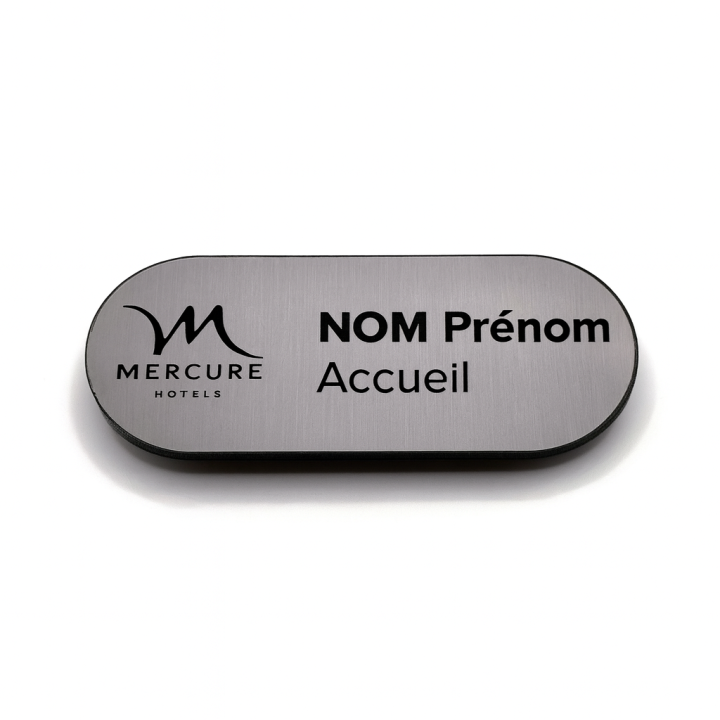 Badge nominatif aimanté ovale 70x30 mm effet métal brossé gravé