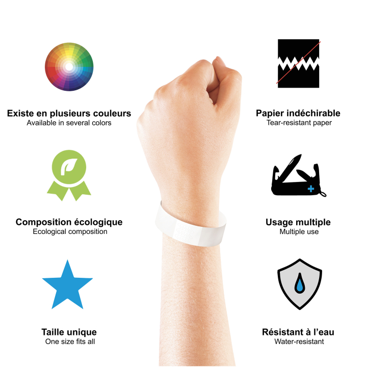 Fabriqués en fibre Tyvek, ils sont légers, résistants et conçus pour être indéchirables. Ils sont dotés d’une fermeture adhésive inviolable, empêchant tout transfert ou réutilisation : des propriétés qui garantissent à l’organisateur une meilleure sérénité quant au déroulement de son événement.
